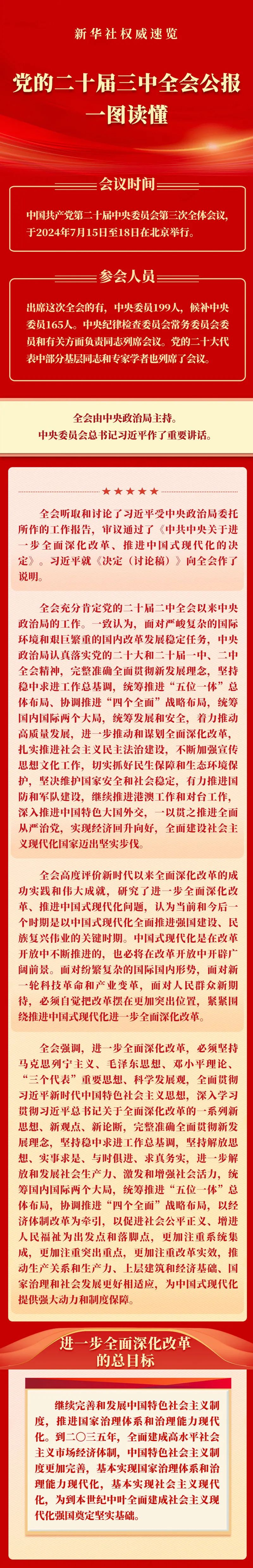 中共中央關于進一步全面深化改革 推進中國式現代化的決定 (2024年7月18日中國共產黨第二十屆中央委員會第三次全體會議通過) 為貫徹落實黨的二十大作出的戰略部署,二十屆中央委員會第三次全體會議研究了進一步全面深化改革、推進中國式現代化問題,作出如下決定。